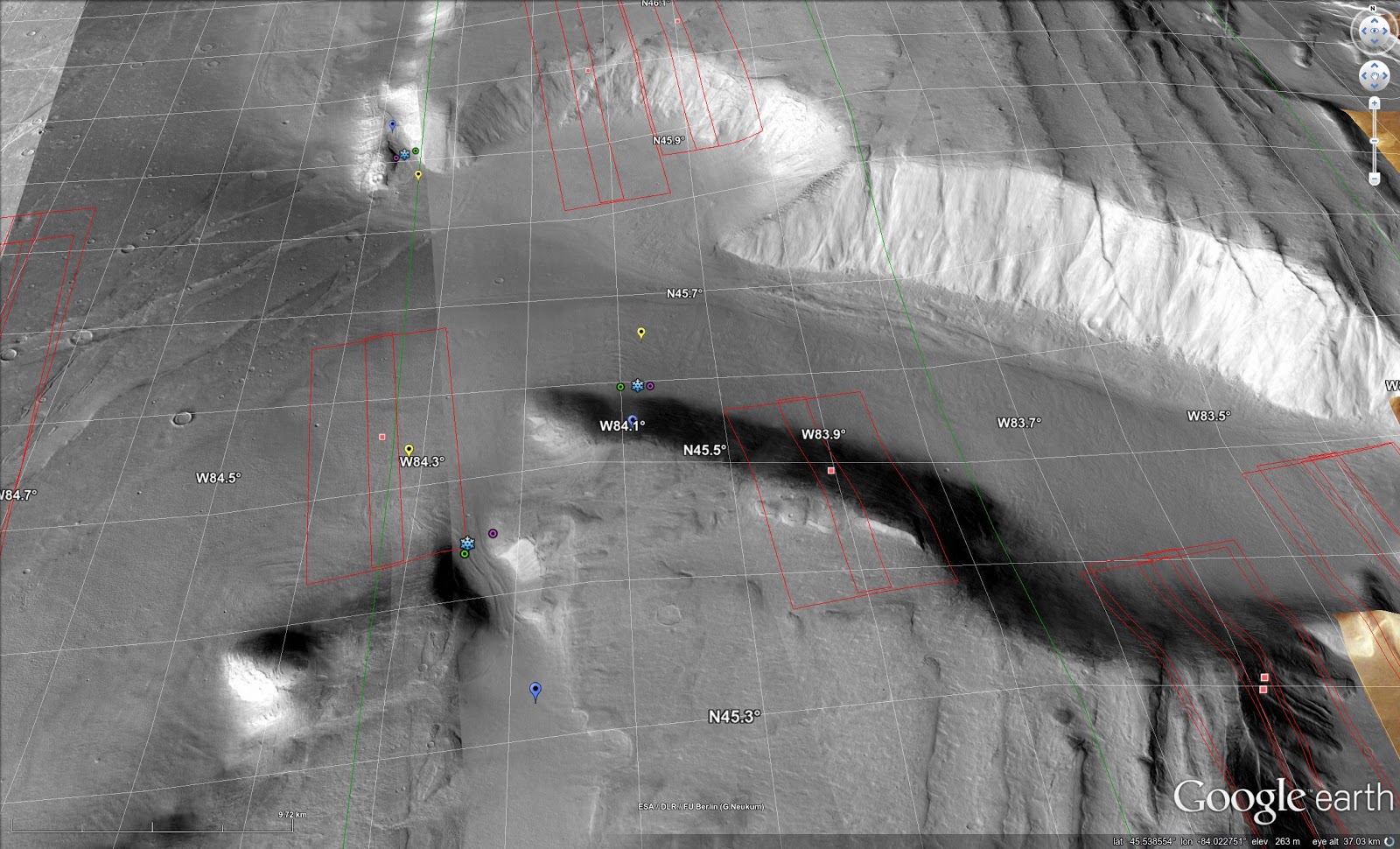 | The same GLFs as the previous image, showing CTX images via Google Earth. Perhaps there has been several glacial epochs in the 'recent' times of the last few Myr that have been superimposed on the longer-term formed topographic channel? |